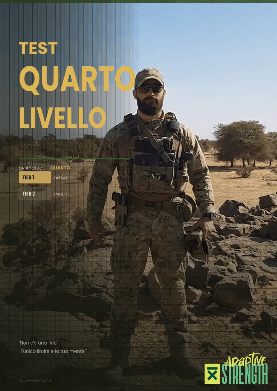 Disponibile in due versioni — Tier 1 Operatore per chi è già a livello selezione e Tier 2 CIl Quarto Livello è un test di valutazione fisica e mentale ispirato ai protocolli di selezione delle Forze Speciali. 4 prove progressive — resistenza, forza, tenuta isometrica e farmer carry senza fine — per misurare quanto sei disposto a sopportare quando il tuo corpo ti dice di fermarti. Disponibile in due versioni: Tier 1 — Operatore e Tier 2 — Cadetto.adetto per chi sta costruendo le basi — il test si adatta al tuo punto di partenza senza mai abbassare lo standard mentale richiesto.